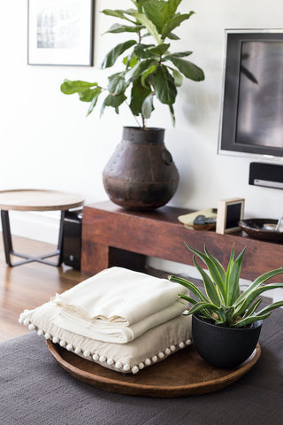 Taupe Chambray Cushion with Pom Pom Trim